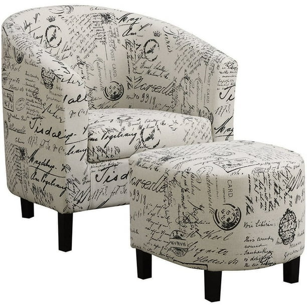 Off White Accent Chair With Ottoman. This charming accent chair and ottoman serve as a conversation piece in any space. Wrapped in off white fabric with a french script pattern, it speaks to artistic flavor. Average rating:0out of5stars, based on0reviews. Transform any corner into a cozy reading nook with an armchair or a tufted chair with plenty of cushions.